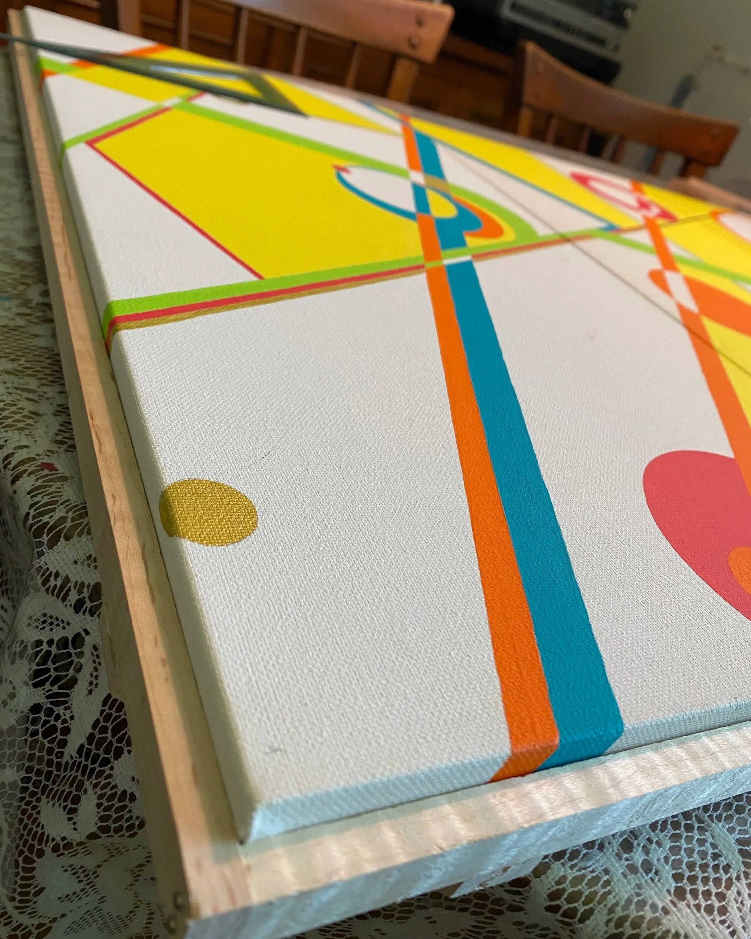For Ryan, painting is less about producing an object and more about entering a mental space. His works, especially the Groove and Ripple pieces, are intuitive rather than planned, beginning without a sketch or map and developing through response and instinct. “Nothing is planned out,” he says. “It’s 100% freeform… a stream of artistic consciousness. The piece tells me what colors it needs. A big circle here, a tiny bold zigzag there.”